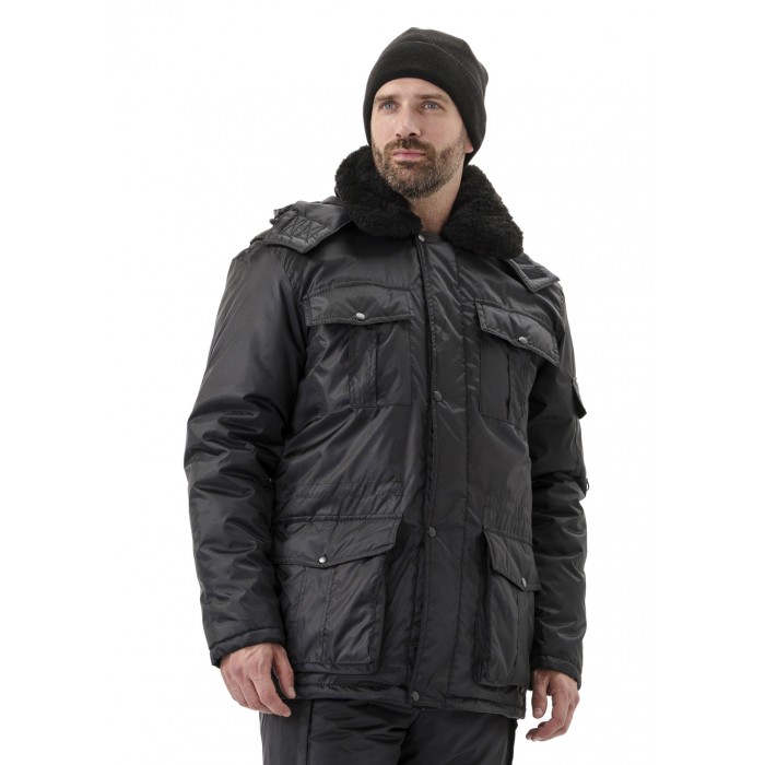Костюм утепленный "ОХРАННИК" черный изготовлен в соответствии с ГОСТ и включает в себя 2 предмета: куртка/брюки. Модель куртки удлиненная, прямого силуэта. Ветрозащитная планка с застежкой на контакт-ленту предотвращает попадание ветра сквозь молнию. На изделии расположены нагрудный карман под рацию, карман с полукольцом под бейдж и нижние накладные карманы с клапанами на ленте-контакт. Плечевые швы оформлены декоративными погонами. Куртка оснащена меховым воротником, утепленным съемный капюшоном.